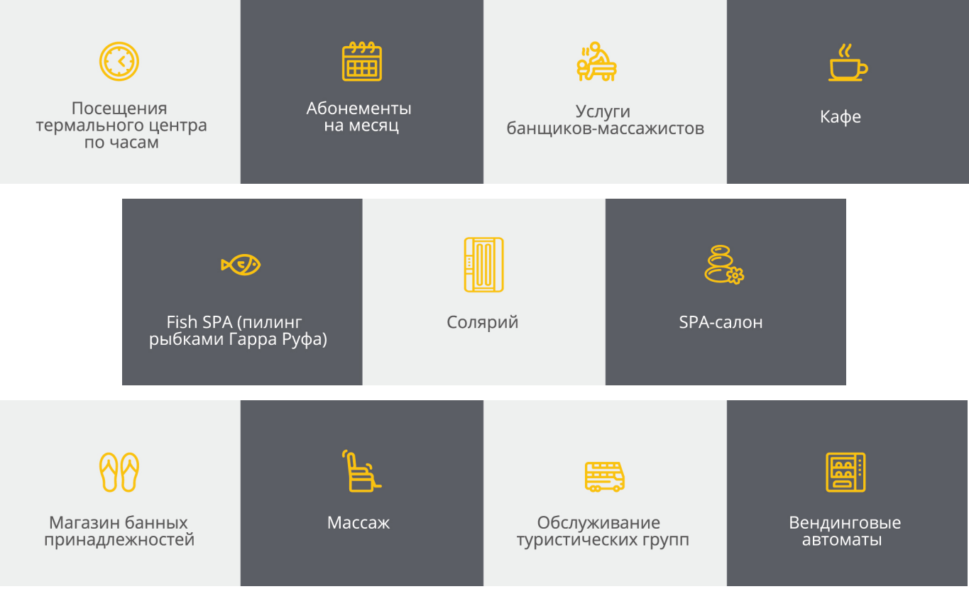 Современный термальный комплекс(термы) представляют собой оздоровительно-развлекательный комплекс, состоящий из лечебных центров, SPA, аквапарков, саун, бань, открытых бассейнов и природных источников.